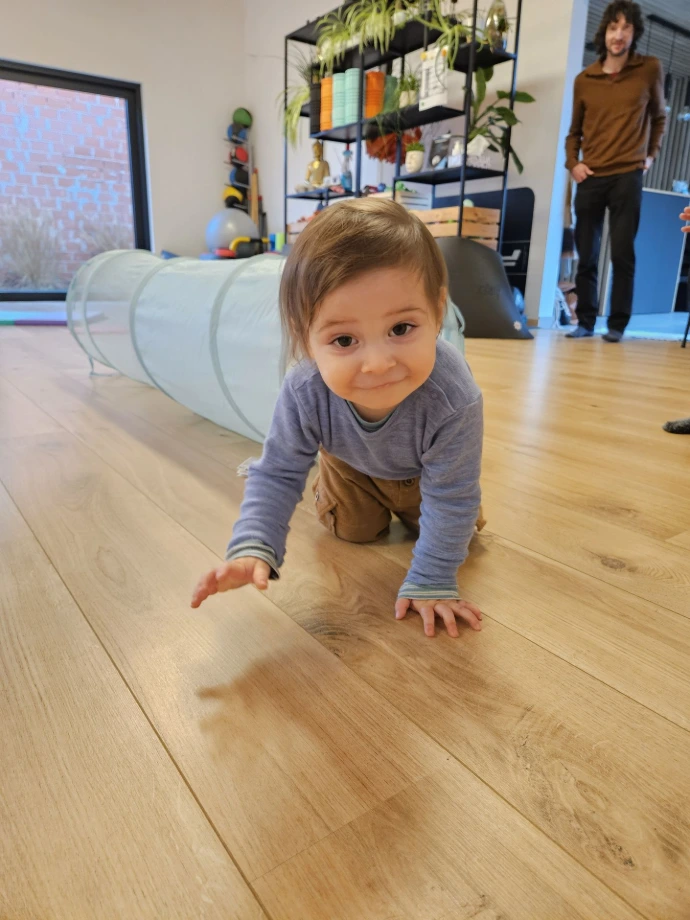 Tijd voor onverdeelde aandacht: zonder telefoon, zonder haast. Tijdens de ouder-kind sessies beleef je samen de magie van bewegen: rollen, wiegen, klauteren... Geen prestatiedruk, wel puur plezier en verbinding. Door samen te bewegen en te spelen, ontdekken jullie niet alleen meer lichaamsbewustzijn, maar bouwen jullie ook aan het vertrouwen in jezelf en in elkaar.